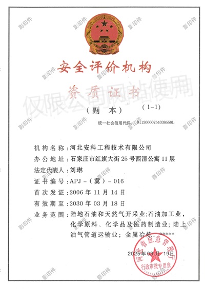 公司具有河北省應急管理廳頒發的安全評價機構資質證書,可在全國范圍內從事陸地石油和天然氣開采業;石油加工業,化學原料、化學品及醫藥制造業;陸上油氣管道運輸業、金屬冶煉等多種類型企業的安全評價。